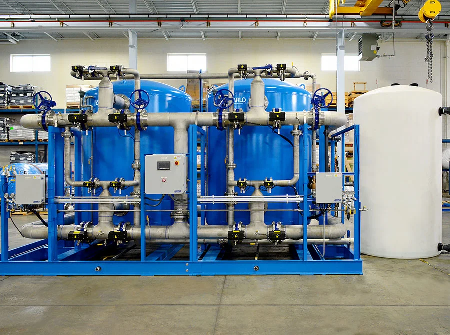 Ion exchange and lime-soda softening systems to reduce hardness and prevent scaling in boilers, cooling towers, and process equipment.
